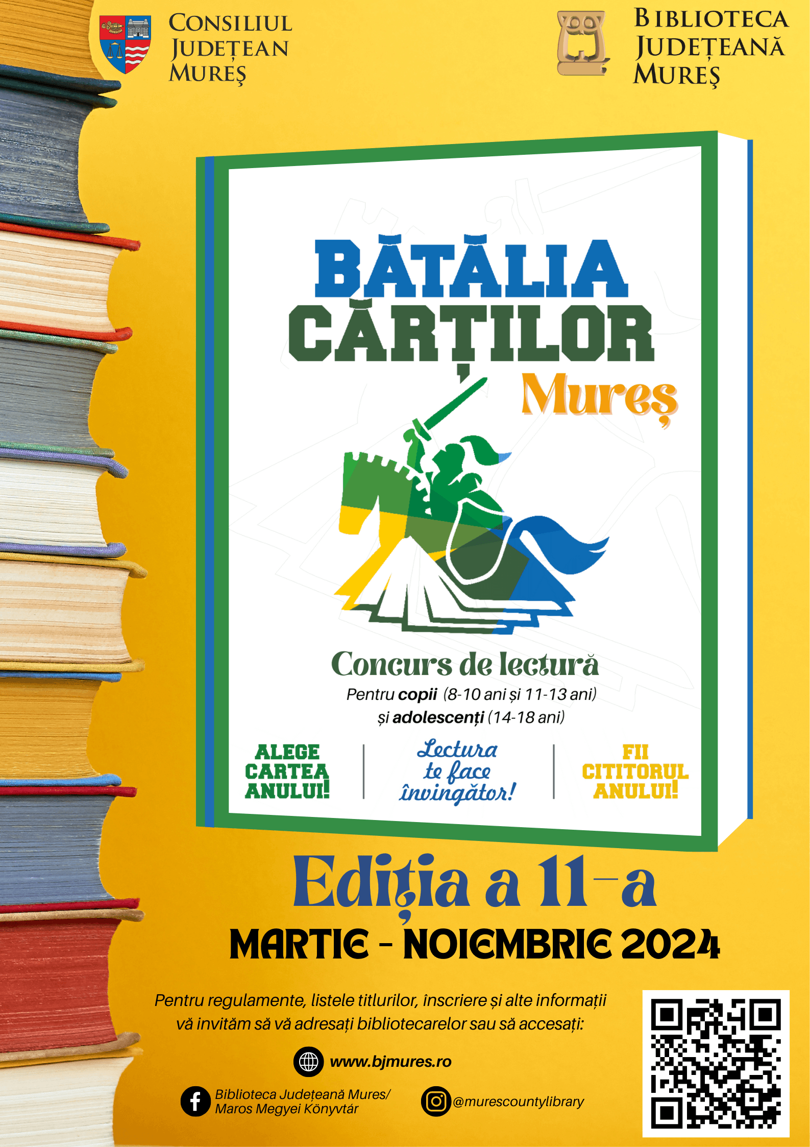 Pentru mai multe informații, listele titlurilor și regulamente accesați: https://bjmures.ro/batalia-cartilor-2024/ (pentru titlurile cărților de la secțiunea maghiară, schimbați limba de afișare site-ului).