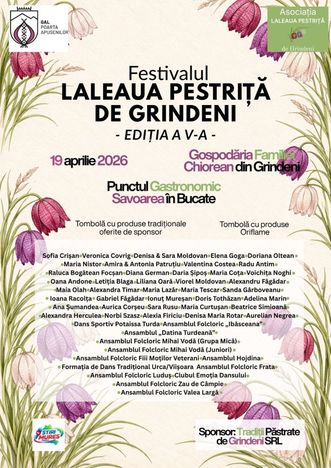Festivalul are și o componentă caritabilă puternică, fiind organizat de Asociația Laleaua Pestriță de Grindeni, în parteneriat cu Asociația GAL Poarta Apusenilor, Sponsor: Tradiții Păstrate de Grindeni, partener media: Știri Mureș.