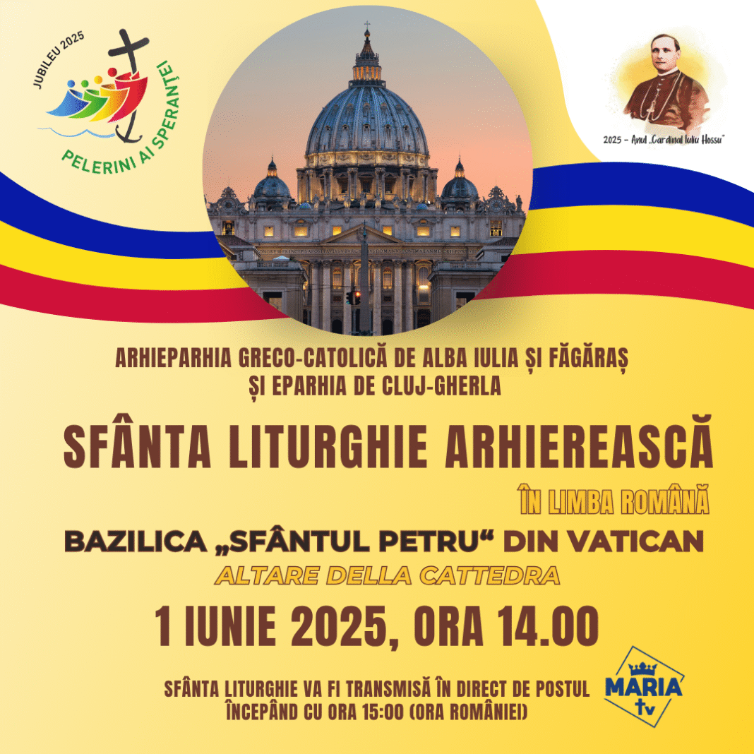 Duminică, 1 iunie 2025, începând cu ora 14:00, în Bazilica „Sfântul Petru” din Vatican, la Altare della Cattedra, va fi celebrată o Sfântă și Dumnezeiască Liturghie în limba română, în rit bizantin, organizată de Arhieparhia de Făgăraș și Alba Iulia și de Eparhia de Cluj-Gherla. Evenimentul are loc în contextul Anului Național „Cardinal Iuliu Hossu”, declarat de Parlamentul României prin Legea nr. 290/2023, ai cărei inițiatori sunt domnii deputați Silviu Vexler și Ovidiu Ganț.