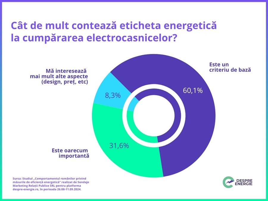 În timp ce 60% dintre participanții la sondaj declară că eticheta energetică este un criteriu de bază atunci când decid să cumpere aparatură electronică sau electrocasnică, pentru circa 32% aceasta este doar „oarecum importantă”. Există însă și o categorie (8,3%), reprezentată în mare parte de persoane tinere, între 18 și 35 de ani, pentru care primează alte aspecte decât clasa energetică, cum ar fi designul produsului dorit și, desigur, prețul acestuia.