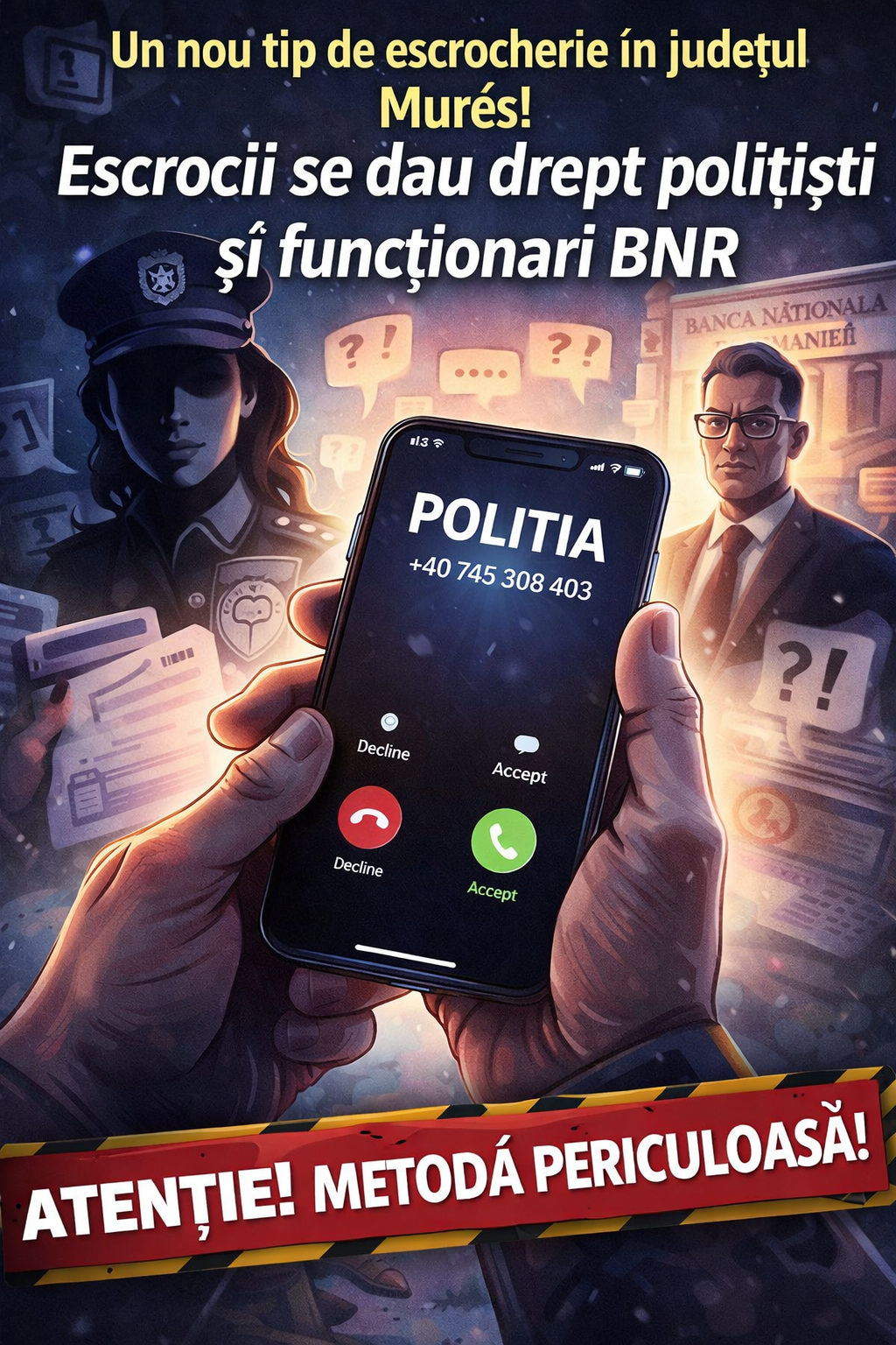 Un nou tip de înșelăciune face victime în județul Mureș, iar metoda folosită de escroci este una extrem de bine pusă la punct, bazată pe presiune psihologică, autoritate falsă și informații aparent credibile.