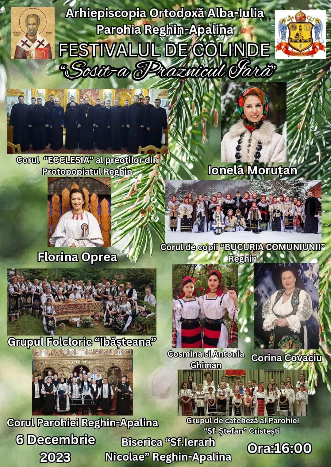 Cu mare bucurie va invitam si în acest an, in ziua de praznuire a Hramului bisericii “Sf. Ier. Nicolae “, la Festivalul de colinde “SOSIT-A PRAZNICUL IARA ” Ediția A V-a, organizat în biserica Parohiei Reghin-Apalina, începând cu ora 16.00.Va așteptăm cu mare drag! Paroh. Pr. Dr. Vasile Farcaș