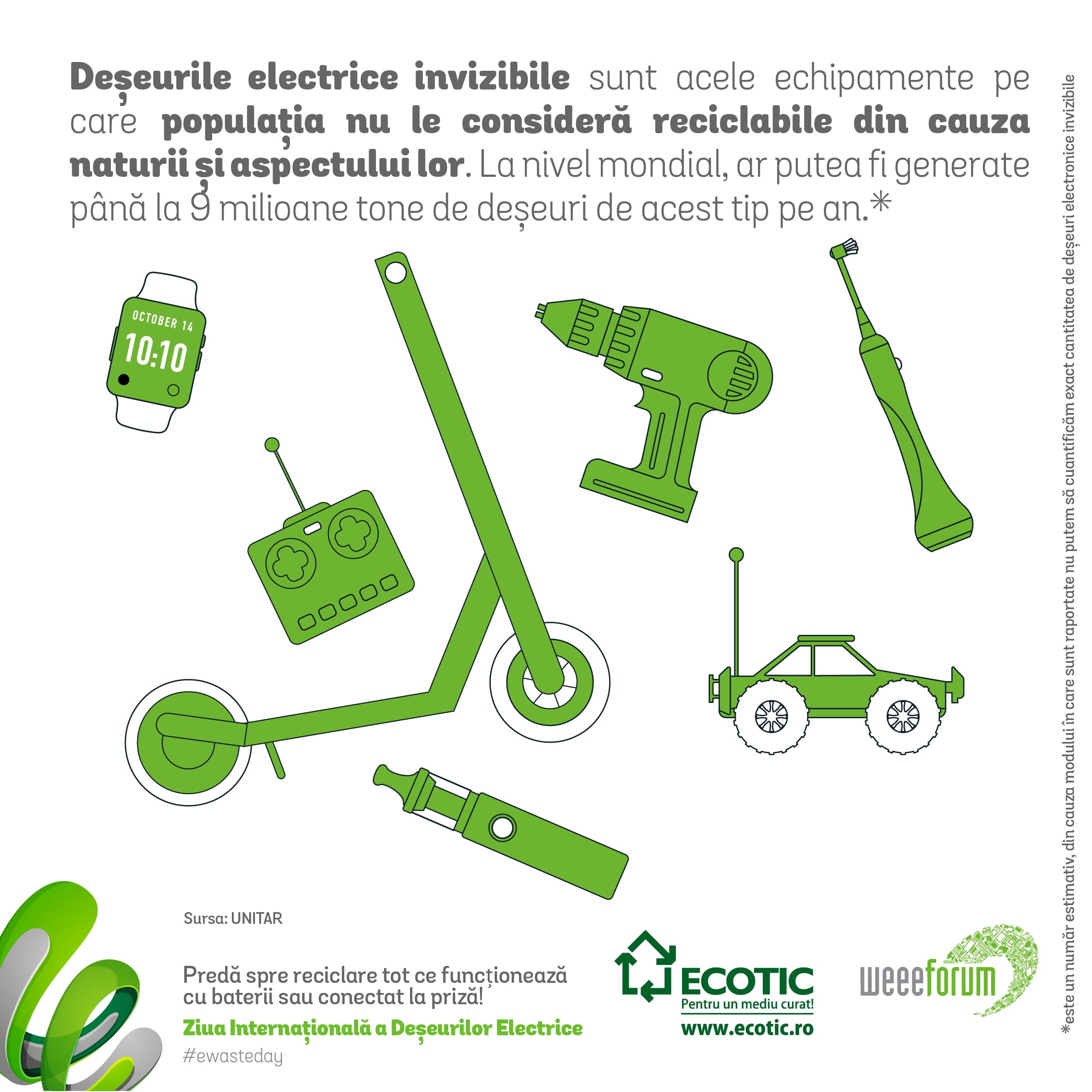 Sloganul de anul acesta este ‘’Predă spre reciclare tot ce funcționează cu baterii sau conectat la priză!’’și se concentrează pe deșeuri electrice considerate invizibile, acestea fiind obiecte care nu sunt recunoscute de către consumatori drept echipamente electrice și, în consecință, ajung să nu fie predate corect, spre reciclare, destinația lor fiind de cele mai multe ori groapa de gunoi. În fiecare an, aproape 1/6 din întreaga cantitate de deșeuri echipamente electrice generate sunt cabluri, jucării electrice, unelte electrice, țigări electrice, stick-uri USB și alte tipuri de deșeuri cu componentă electrică care, de cele mai multe ori, nu ajung pe fluxul de reciclare deoarece populația nu le consideră deșeuri electrice sau nu știe unde trebuie să se debaraseze de ele.