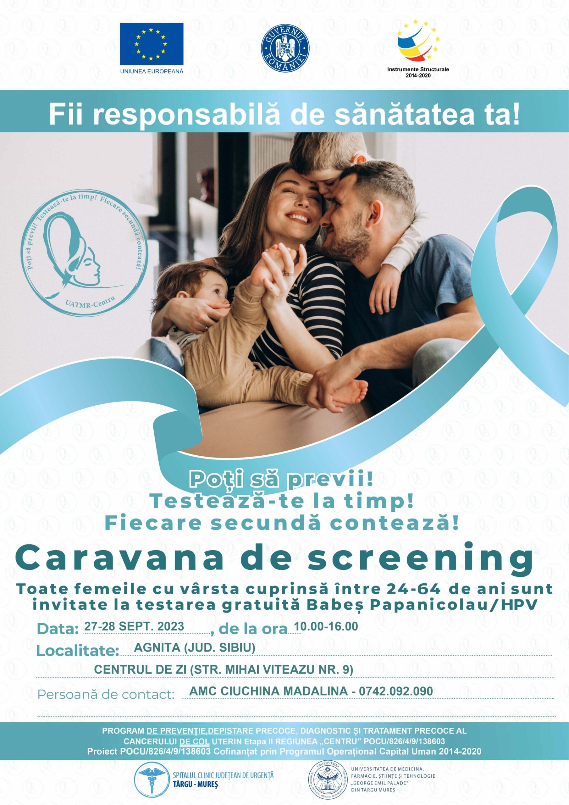 Doamnele şi domnişoarele din Agnita sunt aşteptate, în perioada 27-28 septembrie 2023, în întervalul orar 10.00-16.00, la testare gratuită Babeş Papanicolaou şi HPV, la caravana mobilă pentru screeningul cancerului de col uterin.
