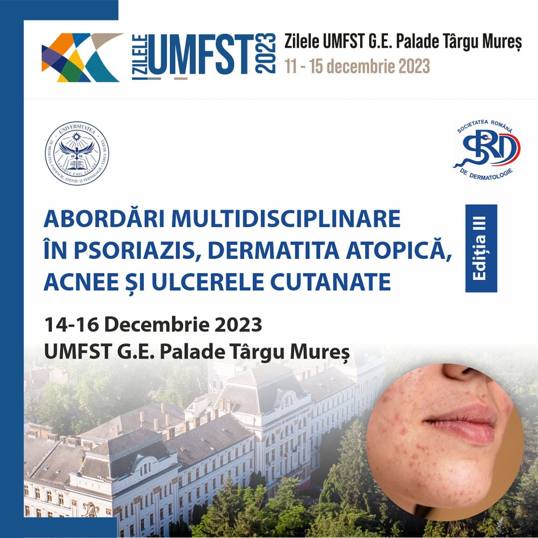 Disciplina de Dermatologie din cadrul Facultății de Medicină, UMFST G.E. Palade Târgu Mureș, și Societatea Română de Dermatologie organizează, în perioada 14-16 decembrie 2023, la Centrul UNiX, o nouă ediție a Conferinței de Dermatologie cu tema: „Abordări multidisciplinare în psoriazis, dermatita atopică, acnee și ulcere cutanate”.