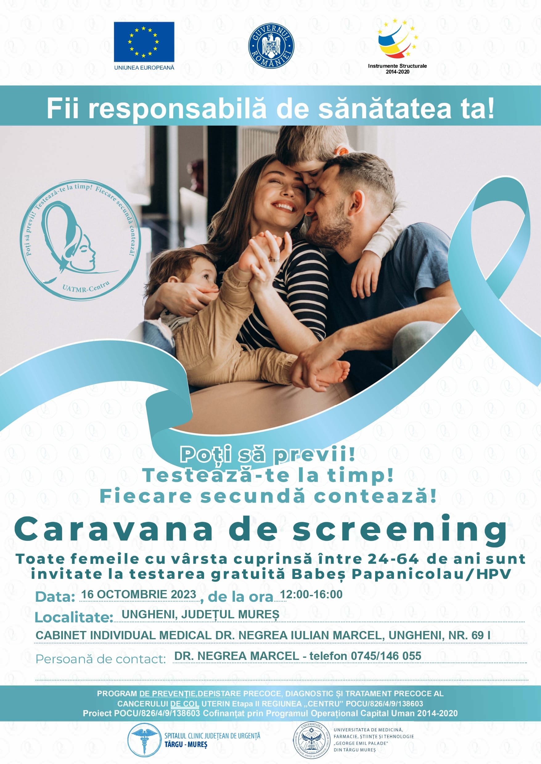 Caravana mobilă pentru screeningul cancerului de col uterin va fi prezentă în data de 16 octombrie 2023, în intervalul orar 12.00-16.00, la CMI Dr. Negrea Iulian Marcel, din localitatea Ungheni, judeţul Mureş.