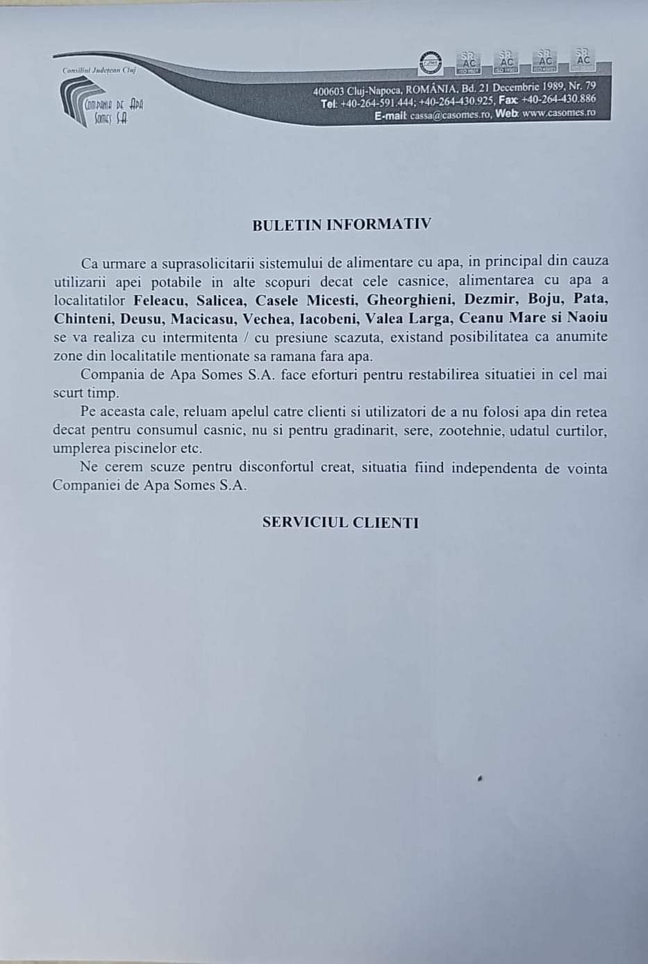 In urma cu doar cateva minute, Primaria Valea Larga a publicat un anunt remis de Compania de Apa Somes privind sistarea livrarii de apa potabila in mai multe localitati, inclusiv Valea Larga.