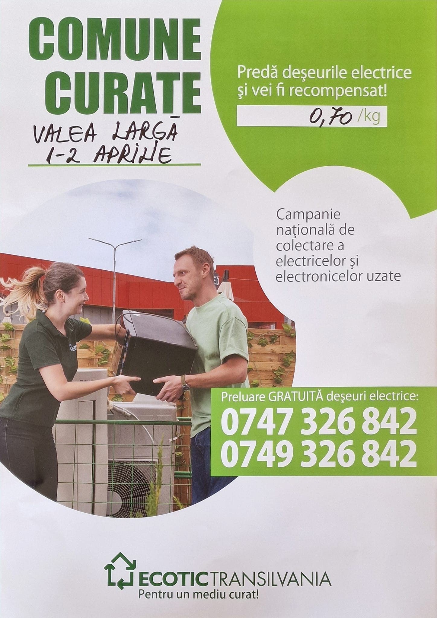 Cetățenii care au în gospodărie deșeuri electrice, electronice sau electrocasnice (de la becuri și baterii, până la televizoare și mașini de spălat vechi) le pot da celor de la Ecotic Transilvania, care vor veni în comuna Valea Largă în zilele de 1 și 2 aprilie.