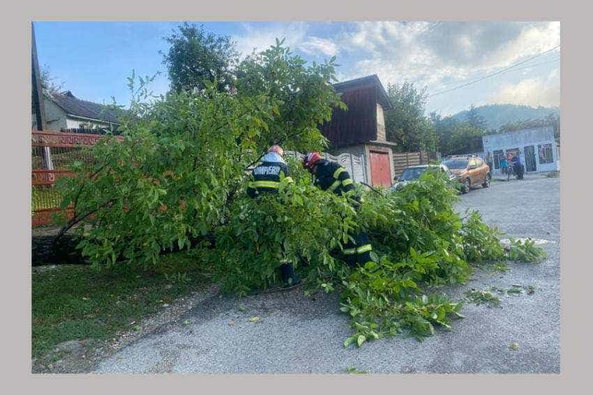 Pompierii mureșeni din cadrul Detașamentul Târgu Mureș, intervin cu o autospecială de stingere pe E60, la ieșirea din localitatea Corunca, pentru degajarea unui copac căzut pe carosabil.