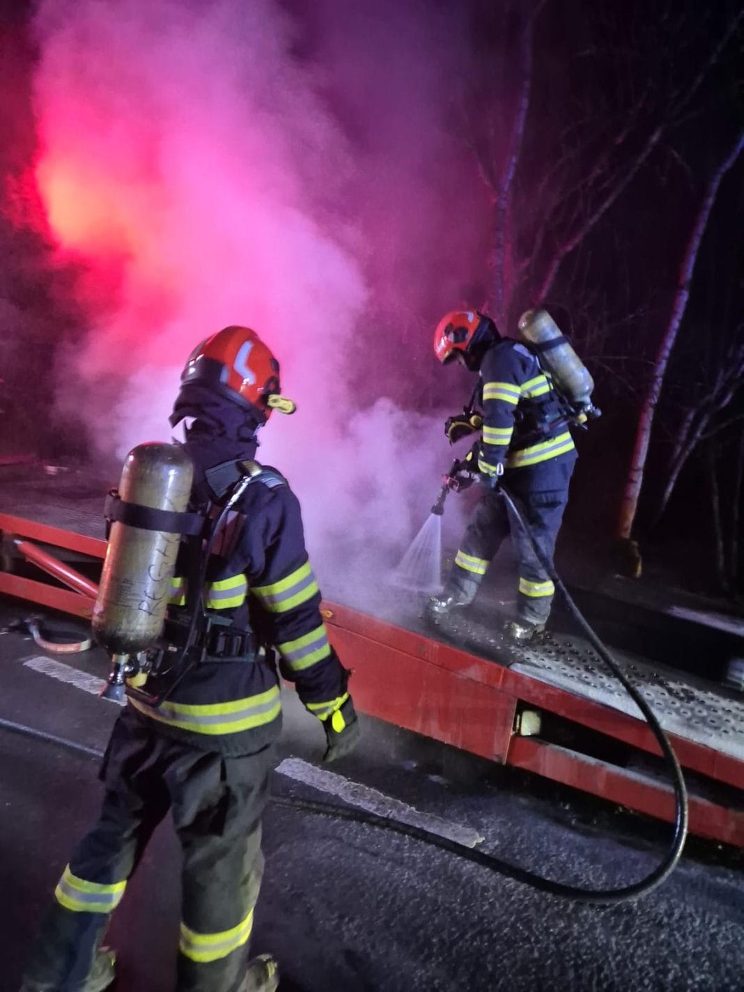 Momente tensionate în cursul nopții, pe raza localității Răstolița, unde o remorcă ce transporta patru autoturisme a fost cuprinsă de flăcări.