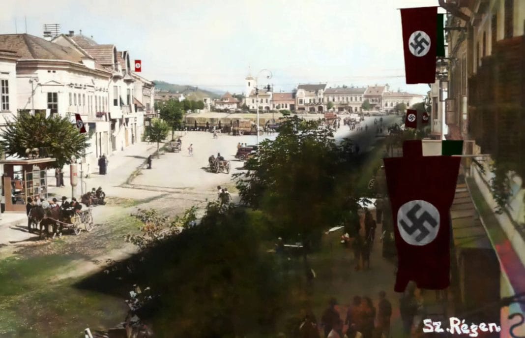 Fotografia surprinde un moment apăsător din istoria Reghinului, într-o perioadă în care orașul trăia sub administrația impusă după Dictatul de la Viena din 1940. În imagine se vede centrul orașului împodobit cu steaguri naziste și ungare, semn clar al alianței dintre regimul horthyst din Ungaria și Germania nazistă.