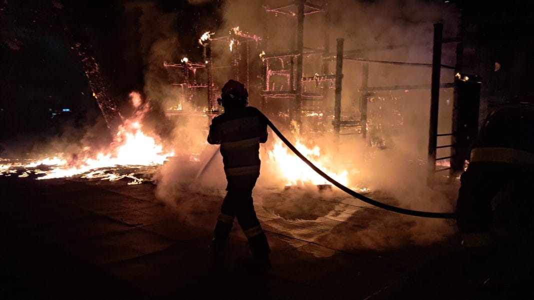 Când părea că noaptea se liniștește, la ora 04:00, un nou incendiu izbucnea în municipiul Târgu Mureș, pe strada Gheorghe Doja. De această dată, ținta flăcărilor a fost un parc pentru copii. Un loc al jocului și al râsetelor s-a transformat într-un decor ars.